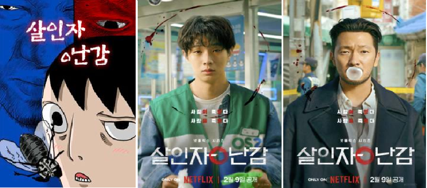 이번에 다루는 넷플릭스 드라마 <살인자ㅇ난감> 역시 꼬마비 작가가 2010년부터 2011년까지 연재했던 동명 웹툰을 원작으로 한다. 제목이 독특하다. <살인자ㅇ난감>에서 ㅇ이 오타가 아닐까 생각할 수 있는데 작가는 스토리를 어떤 관점에서 보고 이해하느냐에 따라서 ㅇ이 다양하게 사용되고 이에 따라 제목이 해석될 수 있다고 했다. 가장 쉽게 해설할 수 있는 ‘살인자와 장난감’이라면 살인자는 계속 살인을 하는 이탕을, 장난감은 그를 쫓는 형사 장난감을 뜻하는 가운데, 배우 손석구가 맡은 형사 장난감은 자신의 이름처럼 감으로 범인을 추적하지만 번번이 실패한다. 그런 의미에서 제목은 살인을 해결하지 못하는 장난감 같은 형사라는 의미에서 붙잡히지 않는‘살인자(이탕)와 형사(장난감)’이 될 수 있다. 만약 ‘살인은 장난감’이라고 제목을 이해한다면 이탕에 의해서 우발적으로 일어나는 장난감과 같은 어처구니없는 사건들에 관한 이야기로 드라마를 이해할 수 있겠다. 또는‘살인자(의) 난감’으로 본다면 주인공 이탕이 별 내세울 것도 없고 큰 의지도 없이 살다가 우연히 살인자가 된 난감한 상황을 맞이한 상태 혹은 전직 형사였지만 현재는 연쇄 살인을 저지르고 있는 송촌의 최후를 난감하게 보는 드라마라고 파악할 수도 있다. 나머지는 시청자가 드라마를 다 본 후 제목을 재해석해 봐도 좋을 것 같다. 8부작을 보면서 혹은 보고 나서 제목을 이렇게 맞춰보는 것도 드라마가 주는 흥미성이다.